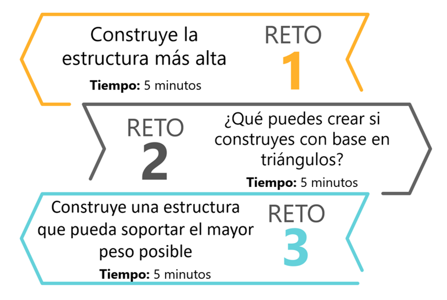 En el primer reto, el objetivo es que los participantes exploren empíricamente la forma, tamaño y peso, así como las propiedades de los elementos asignados, como la resistencia, fragilidad y dureza. Además, el participante identifica el problema y las restricciones a través de la instrucción proporcionada por el instructor. El proceso de análisis les permite buscar entre diferentes opciones para el mejor armado de la estructura. La dificultad del reto radica en la poca experiencia con los elementos y sus propiedades.