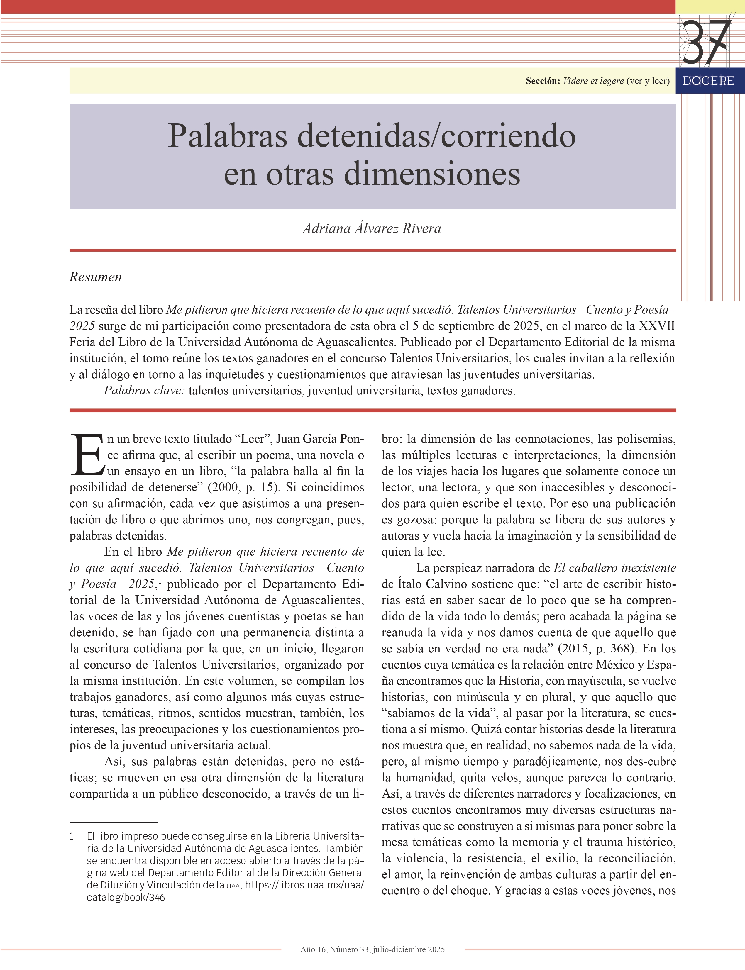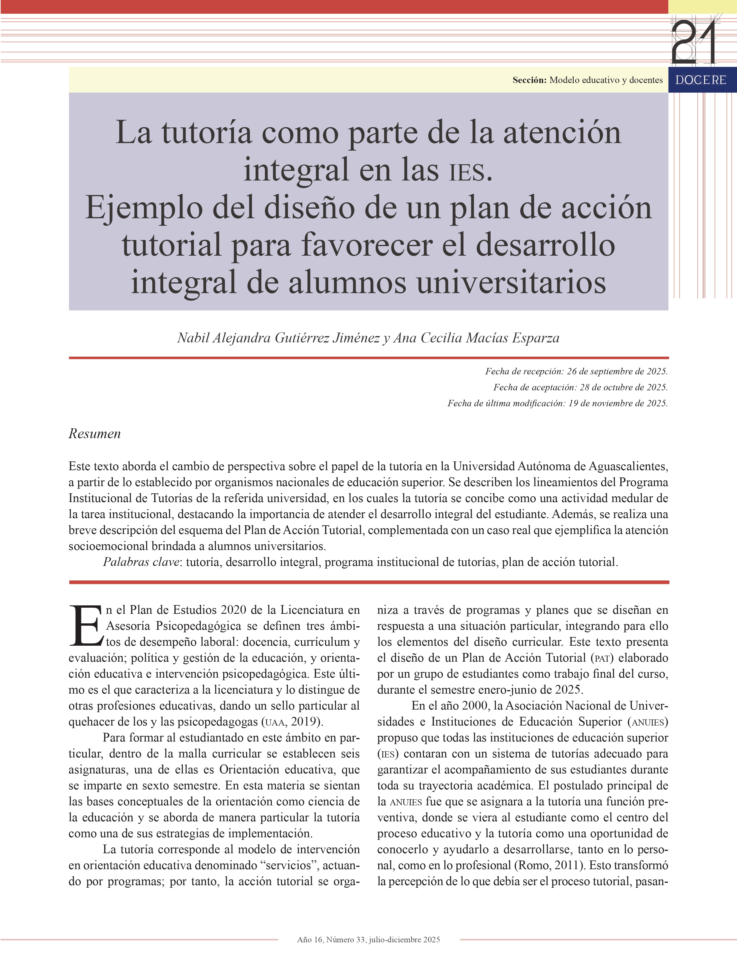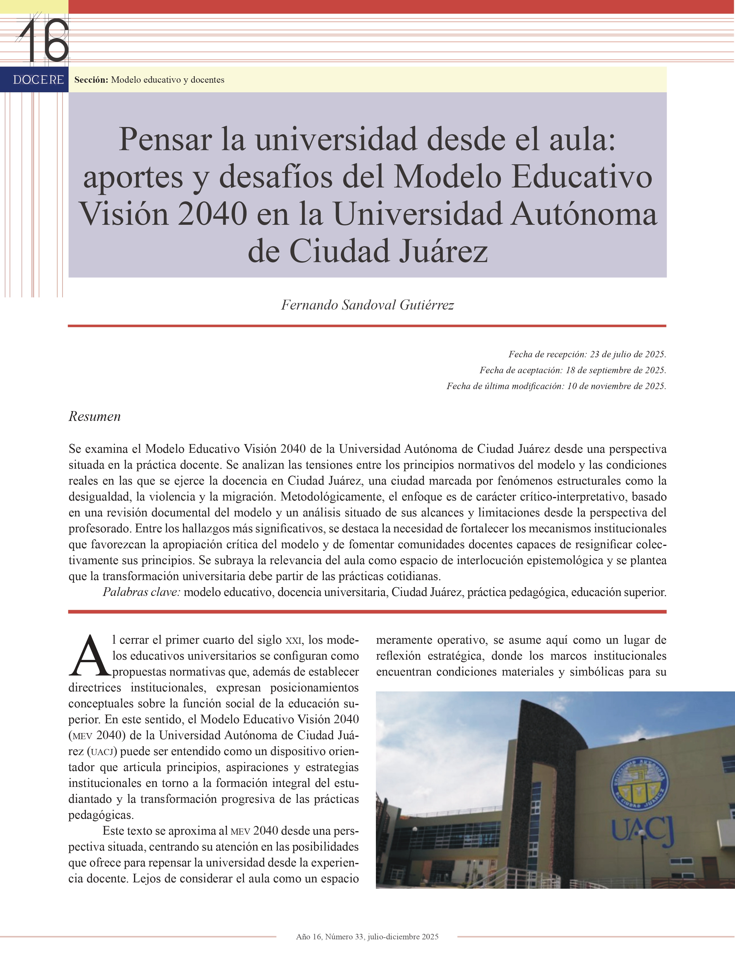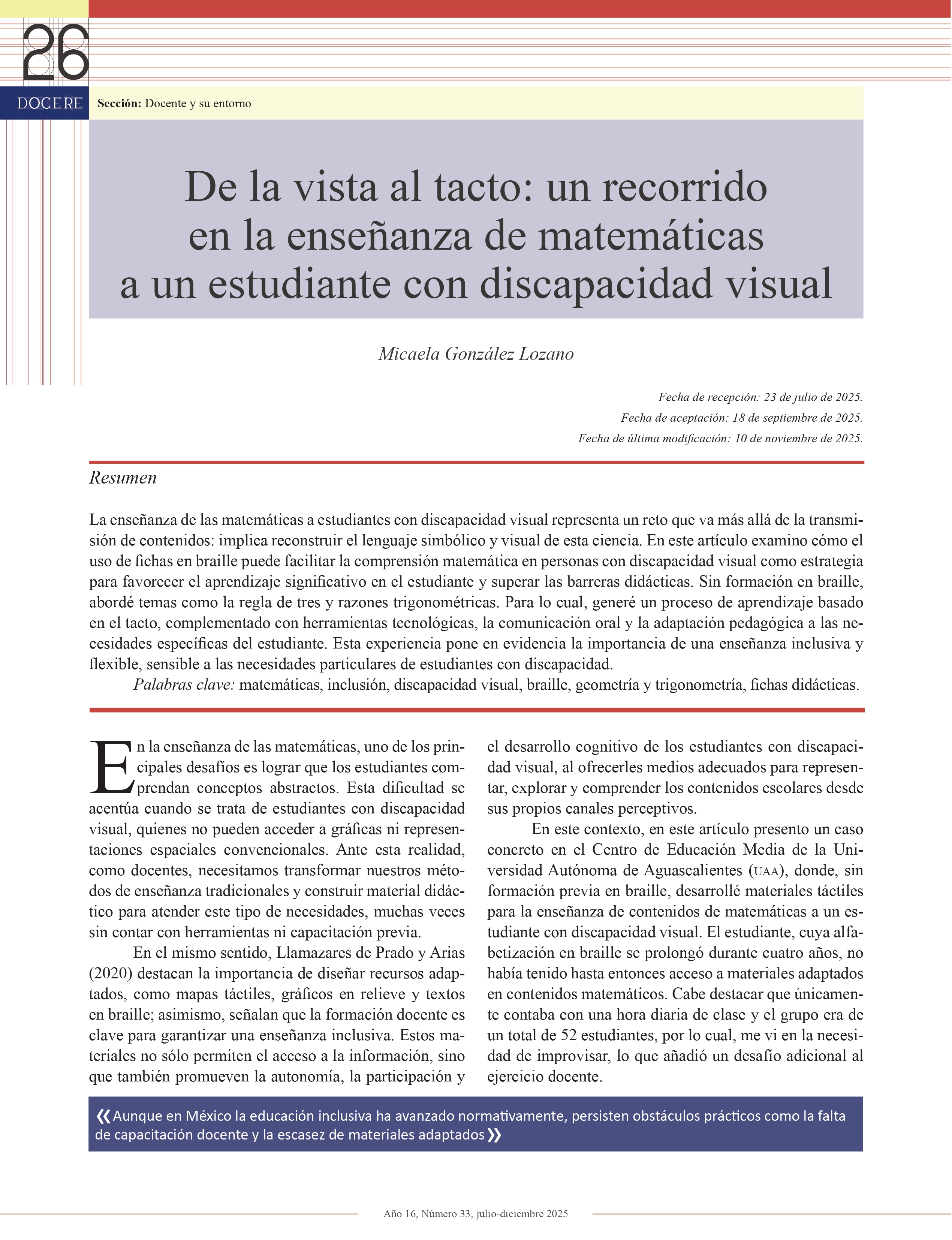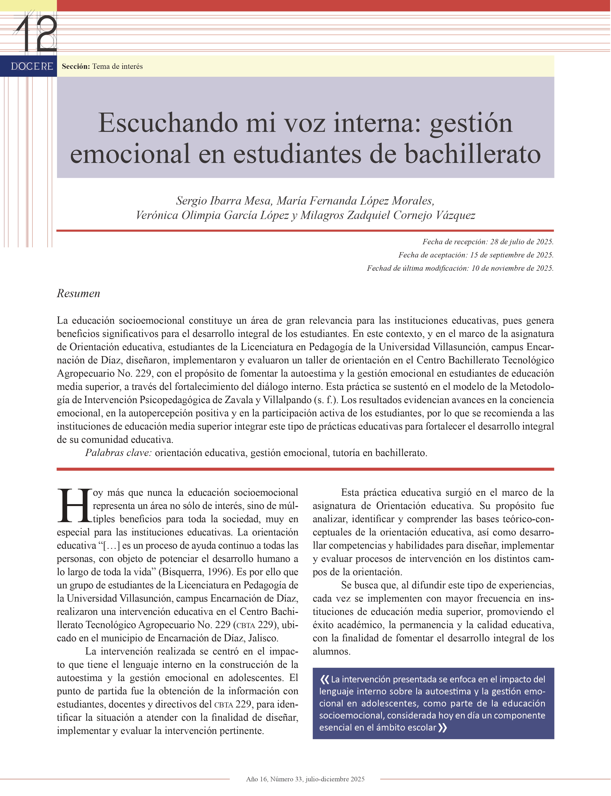 DOCERE, año 16, número 33, julio-diciembre 2025, es una publicación semestral editada por la Universidad Autónoma de Aguascalientes, a través de la Dirección General de Docencia de Pregrado, Departamento de Formación y Actualización Académica. Avenida Universidad No. 940, Edificio Académico Administrativo, piso 4, Ciudad Universitaria, C.P. 20100, Aguascalientes, Ags., Tel. (449) 910 74 00, exts. 31412, 31413 y 31414, https://revistas.uaa.mx/index.php/docere, revistadocere@edu.uaa.mx. Editora responsable: Martha Hilda Guerrero Palomo. Reserva de Derechos al Uso Exclusivo del título No. 04 2018-041714054800-102 e ISSN 2683-2526, ambos otorgados por el Instituto Nacional del Derecho de Autor. Distribución gratuita. Las opiniones expresadas por los autores no necesariamente reflejan la postura de la editora de la publicación. Esta obra está bajo una Licencia Creative Commons Atribución-NoComercial-CompartirIgual 4.0 Internacional, https://creativecommons.org/licenses/by-nc-sa/4.0