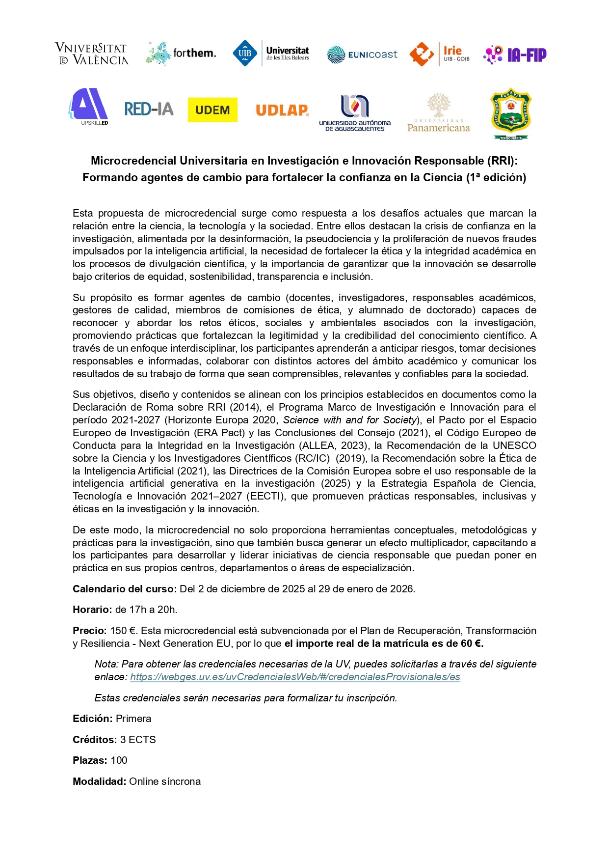 La Universidad de Valencia invita a participar en la Microcredencial Universitaria en Investigación e Innovación Responsable (RRI): Formando agentes de cambio para fortalecer la confianza en la Ciencia (1°a edición), en la que colabora la Dra. Sandra Reyes Carrillo, docente e investigadora del Depto. de Letras de la Universidad Autónoma de Aguascalientes.